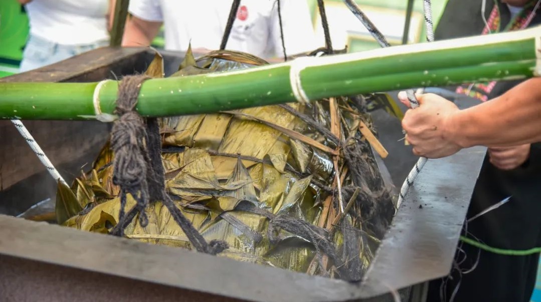 经过24个小时的煮制,“粽王”再次揭开了它的面纱,因现场没有人制作过如此之大的粽子,制粽师傅的内心都十分忐忑,起锅过程如同彩票开奖一般。
